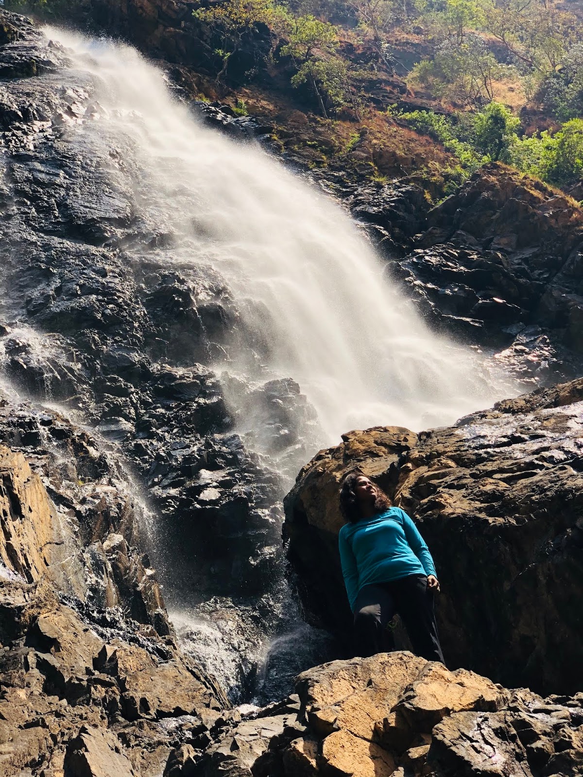 As there was already a group under the waterfall, Manu made a gesture that we will first go to the tier above it. Me,Vishnu and Priya quickly climbed it and found a place of solace. We sat there looking up , how beautifully the water was showering from the top, as if its falling from the blue sky. The water was damn cold but it did not stop us from getting into it. The sound of the waterfall had silenced the mind . And we lost ourselves in its charm and solace.